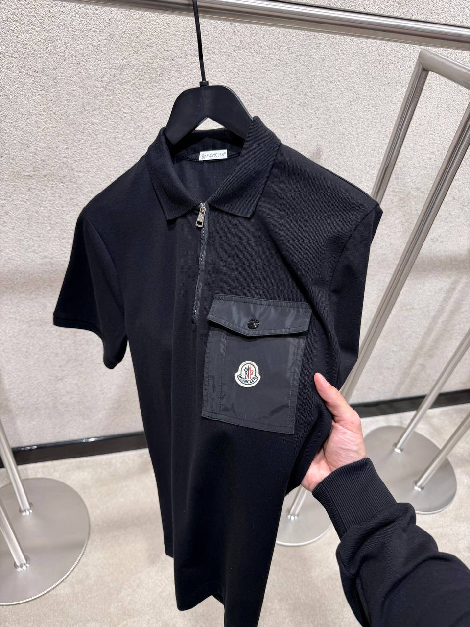 Black Moncler piqué-weave pocket cotton polo shirt